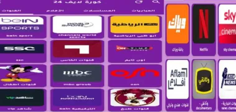 - إلى جانب مباريات كرة القدم يوفر تطبيق تطبيق كورة 24، مجموعة من قنوات التلفزيون الأخري والتي تسمع لك بمتابعة الأفلام والمسلسلات من جميع دول العالم.