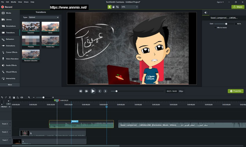 - التأثيرات المرئية: قم بـ تحميل برنامج Camtasia Studio 7 32 bit، ومن ثم تحكم في ضبط الألوان، وإضافة ظل إسقاط وتغيير سرعة القصاصة وغير ذلك الكثير.